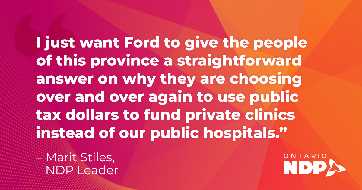 This is unacceptable. And now, instead of investing in our public health care system, Ford’s Conservatives want to funnel public dollars into private, for-profit clinics. They're putting your health on an auction block, and they want to sell it off to the highest bidder. Here's what their privatization scheme will mean for you: